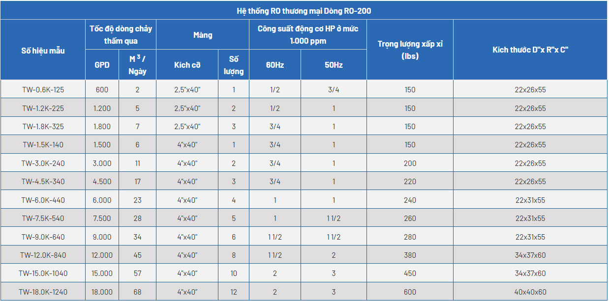 Hệ thống RO thương mại có thể được tùy chỉnh dựa trên nhu cầu thiết kế riêng lẻ bao gồm liều lượng hóa chất, vệ sinh ván trượt , chất chống cáu cặn, bộ lọc, v.v. Máy thẩm thấu ngược thương mại của chúng tôi có thể chứa từ 600 đến 18.000 GPD , với TDS của nước cấp từ 1.000 đến 5.000 ppm. Các tính năng này có khả năng loại bỏ độ cứng, clo, mùi, màu, sắt và lưu huỳnh. Tiết kiệm và hiệu quả, máy thẩm thấu ngược thương mại RO-200 có công nghệ thẩm thấu ngược mới nhất để loại bỏ muối hòa tan , các hạt, chất hữu cơ, khoáng chất, tanin và các chất gây ô nhiễm khác khỏi nước có trọng lượng phân tử lớn hơn 150-250 Dalton. Tại Pure Aqua, chúng tôi sử dụng màng loại bỏ cao, tiết kiệm năng lượng và hiệu quả nhất do Dow Filmtec , Hydranautics , Toray sản xuất .
